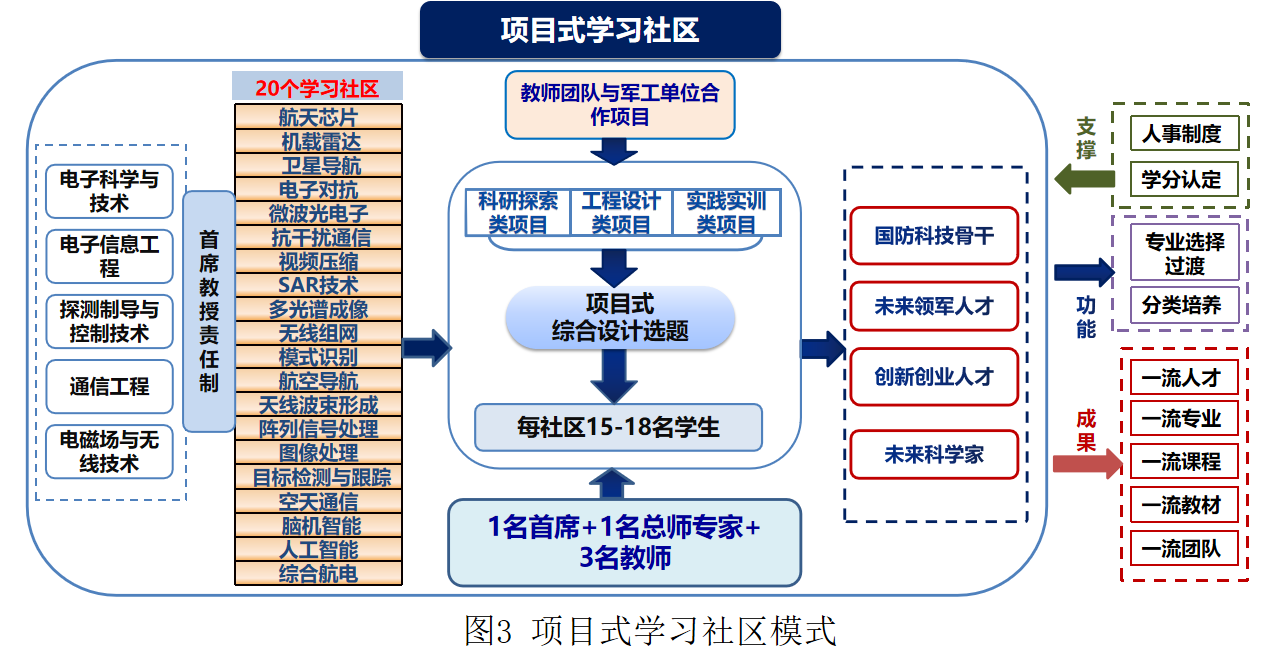 3.依托学院优秀科研团队,联合国防科研院所,组建项目式学习社区,为“总师型”人才提供精准的学业指导。以项目式课程为牵引,依托科研团队,联合国防科研院所,组建项目式学习社区。以国防领军人才为首席教授,以骨干教师、总师专家为社区导师,组建社区指导教师团队,解决电子信息大类培养模式下本科生学习规划不够科学、学业指导不精准问题。创新学习社区运行模式,专业方向适度交叉,分类设置航天芯片、机载雷达、卫星导航、电子对抗、微波光电子、抗干扰通信等国防军工、空天电子特色等项目,以问题探索为指引,培养学生的工程实践、科研创新能力,让学生在解决问题中实现知识与能力的同步提升,培养学生系统性思考与实践能力。四个专业共建设项目式学习社区20个,近一年立项大学生创新创业项目60余项,获得国家级学科竞赛奖励50余项、中国国际大学生创新创业大赛全国金奖1项、火箭军智箭·火眼”人工智能挑战赛决赛金奖1项。